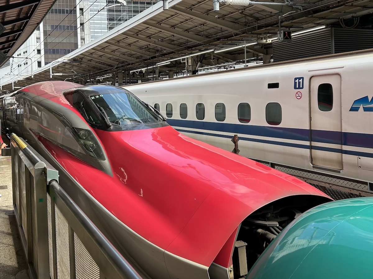 赤がこまちで緑がはやぶさ。連結してることを知らなくて危うくはやぶさに乗り込むところだった!